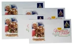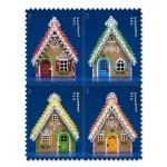 This stamp is part of a block of four issued for the 2013 holiday season. Designers constructed the gingerbread houses specifically for the stamp.
