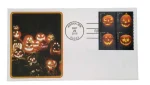 The sheet of 20 stamps features four different photographs of jack-o’-lanterns. The jack-o’-lanterns were carved by Paul Montanari and photographed by Sally Andersen-Bruce. The stamps were designed by art director Derry Noyes.