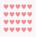The stamp art features horizontal lines of red and pink hearts on a white background. Toward the center, red hearts in varying sizes replace pink hearts in a formation that creates one large red heart, the focal point of this graphic design.