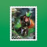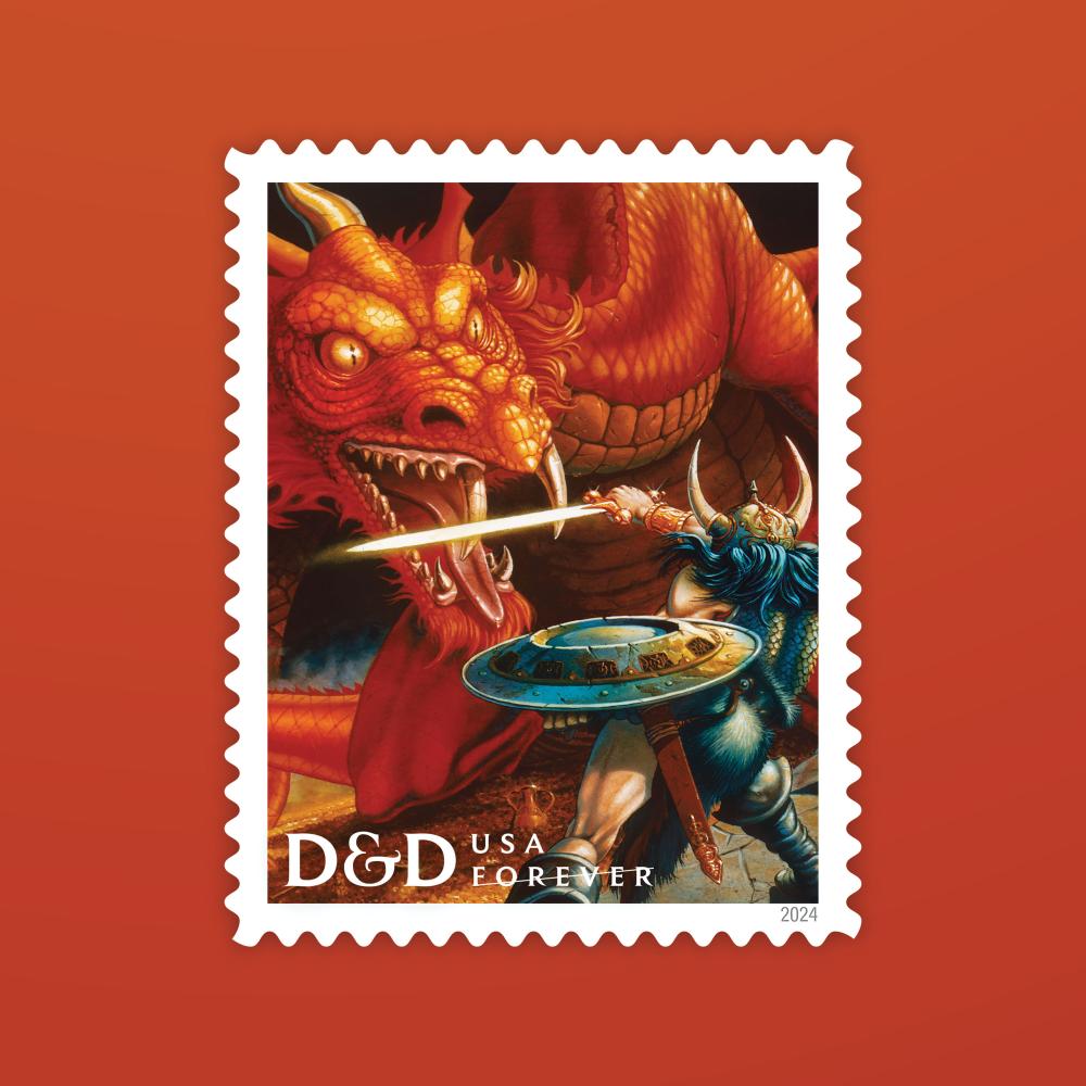 10 Forever stamps issued for the 50th anniversary of Dungeons & Dragons. They picture 10 different designs showcasing characters, creatures, and encounters from Dungeons & Dragons. The selvage of the pane of 20 pictures a party of adventurers fighting a dragon, a gold 20-sided die (d20), and an example of a Dungeons & Dragons map.