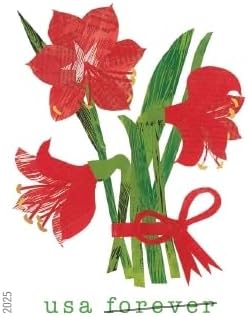 The booklet of 20 stamps features 4 images that evoke scenes of the season: a bouquet of 3 scarlet amaryllis flowers, a holiday wreath topped with a red bow, winter fruit set against an evergreen branch, and cardinals atop mistletoe. Art director Derry Noyes designed the stamps with artwork by Denise Fiedler.