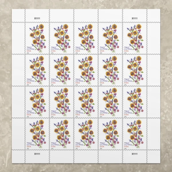 Wild sunflowers’ smaller size makes them perfect for delicate bouquets, as depicted on the 2022 two-ounce-rate stamp. Paired with other colorful blooms, the design serves as a cheerful, year-round reminder of summer. Given the universal appeal of sunflowers, it is an excellent choice for mailing greeting cards, wedding invitations, and other heavier letters.